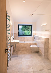 the perfect eco-friendly home for their client. As part of the project, we also carried out first and second-fix plumbing works, which included installing some stunning new bathrooms. Finally – yes, there is more – we installed an in-roof solar PV installation using Trina 415w panels and a Solis