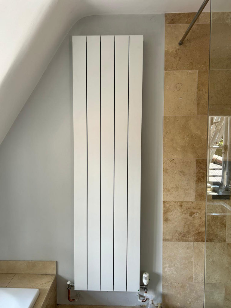 With these heat pumps set up, we were then governed by pipework distance requirements. This meant we had a tricky job of bringing the pipes up through the narrow roof, across the new part of the house, and into the old part. Then – yes, there was more – we also took out the old boiler, fitted the internal units in the same location, replaced the cylinder into the loft, and added a few new radiators (and replaced several others) with triple radiators and aluminium radiators to meet the room’s heat loss; in fact, every job we complete is with the customer’s best interest at heart.