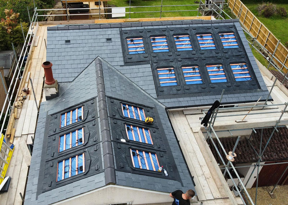 Once we re-felted and battened each roof we were ready for the solar photovoltaic system to be installed. Once the counter battening was fitted, the solar trays were screwed down before the roofer completed the roof tile works. The client at this stage opted to install slate tiles back on instead of the old ones as he thought this would be a better finish and had planned to do the garage roof at a later date. Once the roofer had finished his work we would then come back to drop in the solar panels and fix them securely.