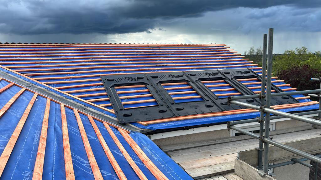 The client was looking to have an in roof solar system to keep the panels as low profile as possible but when we took off the existing concrete tiles a lot of the existing battens and felt were in a really poor condition so once we discussed options with the client we ended up re-felting and battening across all main roofs.